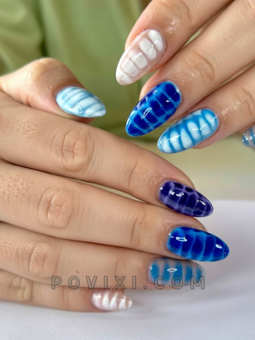 Trendsetters should choose expressive shapes combined with bold pops of color for this cheerful nail design. Nails painted in solid navy, bright red and white with scattered stars bring a young and patriotic essence to your hands. Various small dots, floating star motifs, and abstract semi-transparent shapes over the clear polish base create an artistic and creative maximalist nail design approach inspired by Park Eunkyung who shares easy-to-do nail styles. Everyone can wear the rounded pointed nail shape during celebrations as it allows you to express yourself creatively at any summer gathering.