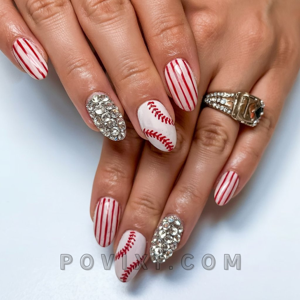 Baseball is the epitome of American summer spirit, so this manicure design combines athletic devotion with stylish glamour. Red pinstripes paired with embroidery details and shiny rhinestone accents on the accent nail present a vintage sports style with trendy femininity. A round manicure with neutral base tones gives visible attention to detail while establishing itself as an ideal option for Memorial Day celebrations or big games. People who want themed designs along with glittery details in their summertime look should consider this design option.