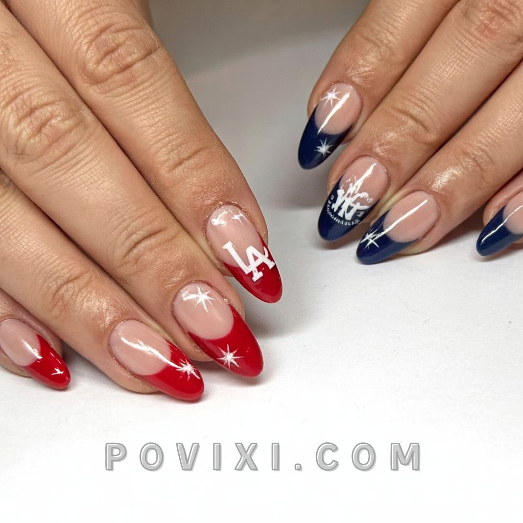 This split nail look combines bright red French tips with blue tips that feature small stars and famous American baseball city logos. The almond outline adds sophistication to this design while maintaining the important symbols that represent the sports teams. People can easily achieve this elegant nail style at home using do-it-yourself methods to show their allegiance during Fourth of July celebrations or any sporting event.