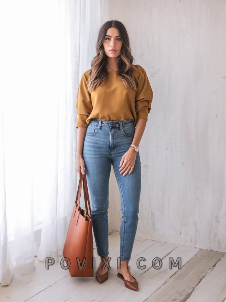 For a casual yet professional look, pairing denim skinny jeans with a puff-sleeve tan blouse creates a simple, chic balance. This outfit works well for elementary casual days or high school teachers who want an effortless yet stylish summer wardrobe. A tote bag and pointed-toe flats elevate this otherwise laid-back outfit.