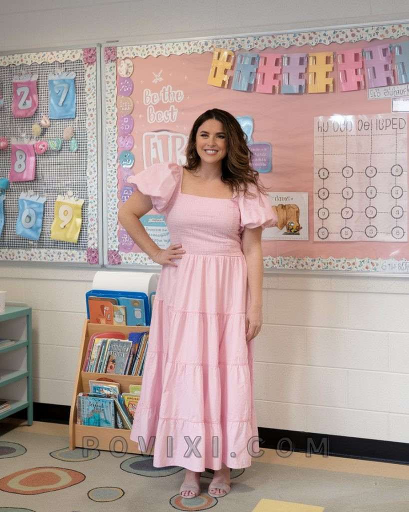 Soft, elegant, and breathable, this pink maxi dress with puff sleeves is perfect for elementary casual dressing. The smocked bodice ensures a comfortable fit, while the tiered skirt adds movement, making it ideal for warm spring days in the classroom. Pair it with nude sandals for an effortless yet polished look. Teachers who prefer comfy yet stylish outfits will love how breezy and cute this dress feels, making it an ideal pick for hot weather teaching days.