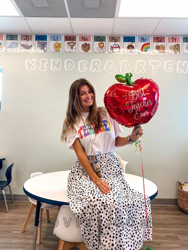 This outfit brings a cute, youthful vibe with a colorful teacher-themed graphic tee tucked into a flowy, spotted skirt. A perfect choice for a preschool teacher who needs to stay active while looking stylish. Complete the look with comfortable sneakers or sandals. This style embraces personality and creativity while keeping things comfy and professional for interactive teaching environments.