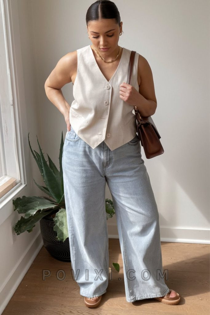 For those who love a casual, minimalist aesthetic, this sleeveless beige vest paired with wide-leg denim is a winning combination. It’s comfy and effortlessly chic for a high school teacher who wants to look polished yet relaxed. Wide-leg jeans are making a strong comeback in 2025, offering comfort, breathability, and a flattering silhouette, especially for plus size figures.