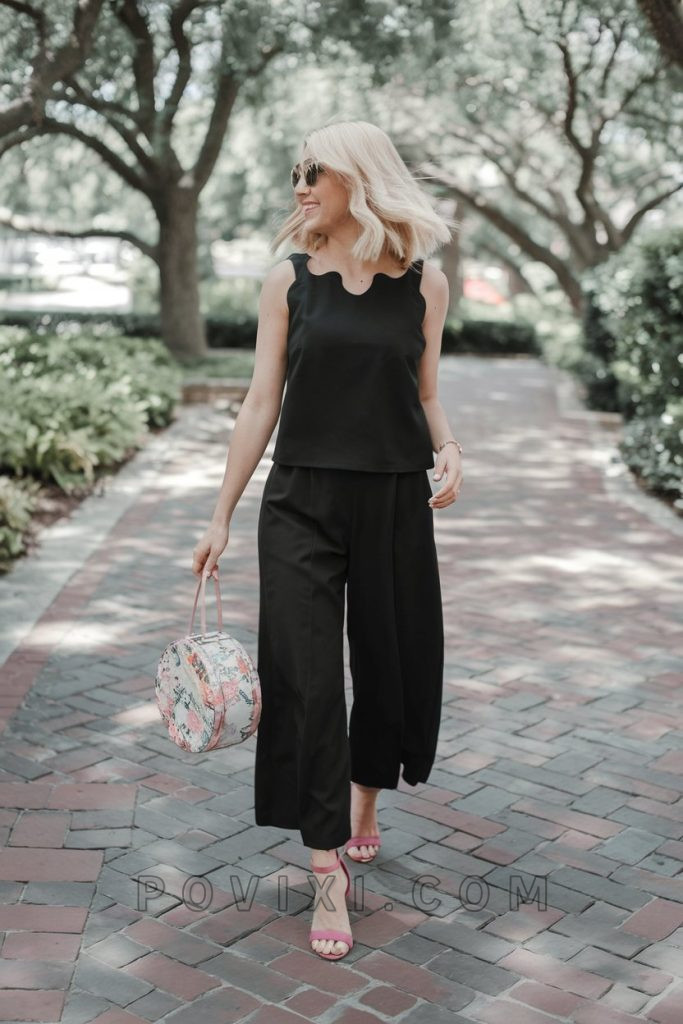 For teachers who love sleek elegance, this black two-piece set is a stylish yet functional option. The sleeveless top with a wavy neckline paired with wide-leg cropped pants creates a streamlined look, ideal for plus size educators who prefer timeless, flattering outfits. Add bright-colored heels or accessories for a spring-ready contrast.