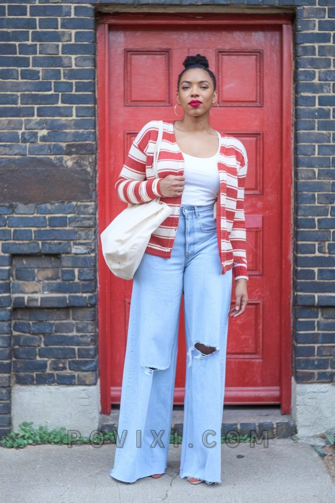 Perfect for a late summer afternoon, this combination of a striped cardigan, white tank top, and distressed jeans is a go-to for relaxed classroom days. It’s a versatile look that works well in both elementary casual and high school settings. Pair with a tote bag and simple sneakers for the ultimate teacher-on-the-go look.