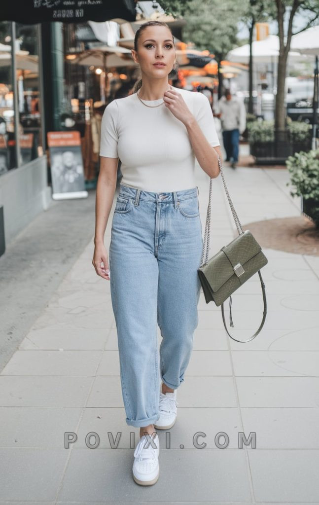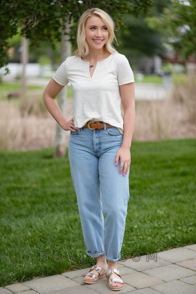 A crisp white tee is a wardrobe staple, and pairing it with light-wash, loose-fit jeans creates the ultimate elementary comfy outfit. Whether you’re moving around a preschool classroom or standing all day in high school, this look ensures you stay fresh in the hot weather. The tucked-in tee adds structure, while white sneakers complete the casual and comfy aesthetic. Accessorize with a structured handbag for a sophisticated finish. If you’re looking for a plus-size alternative, opt for a slightly oversized tee and straight-leg jeans to maintain a balanced silhouette.