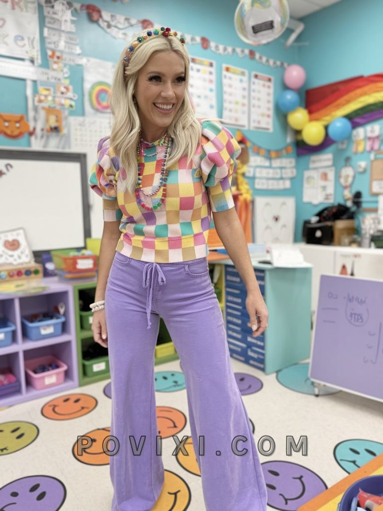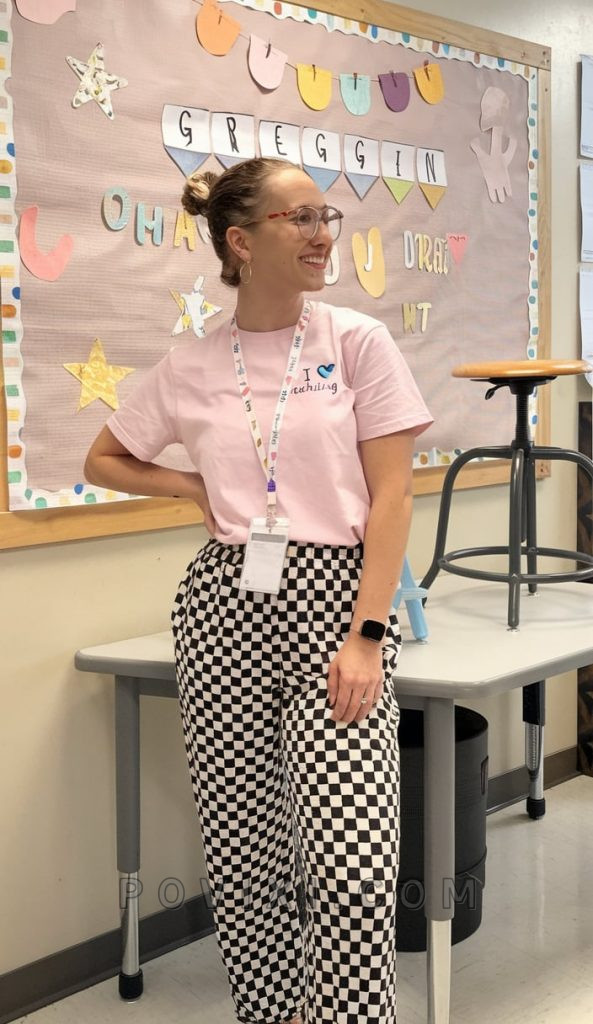 For those who love a statement piece, these black-and-white checkered pants offer a bold yet professional touch. Styled with a soft pink graphic tee, this look is perfect for teachers who appreciate casual yet put-together outfits. The addition of glasses and a lanyard keeps things classroom-appropriate, while the high-waisted pants offer a flattering fit for various size ranges.