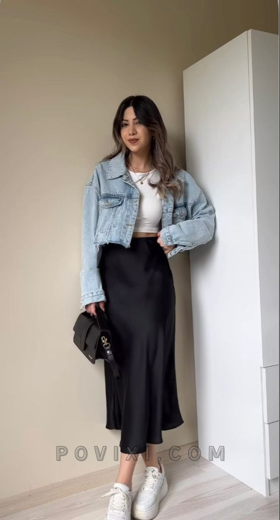 Edgy Yet Feminine: Black Satin Skirt & Denim Jacket Combo