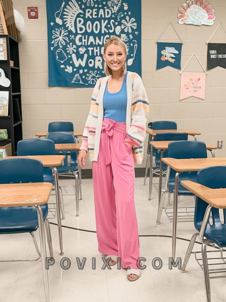 Nothing says spring and summer like pastel colors. This teacher keeps things cute with hot pink wide-leg pants, a ribbed blue tank, and a striped knit cardigan that adds texture. This ensemble blends comfy and professional, making it a great choice for high school or preschool teachers. Minimal gold accessories complete this effortlessly stylish look. If you want to add some contrast, opt for a white blouse instead of the blue tank, or wear a structured blazer to give this outfit a more business-casual appeal. This outfit can also work well for late summer, transitioning into fall with a simple swap of sandals for closed-toe shoes.