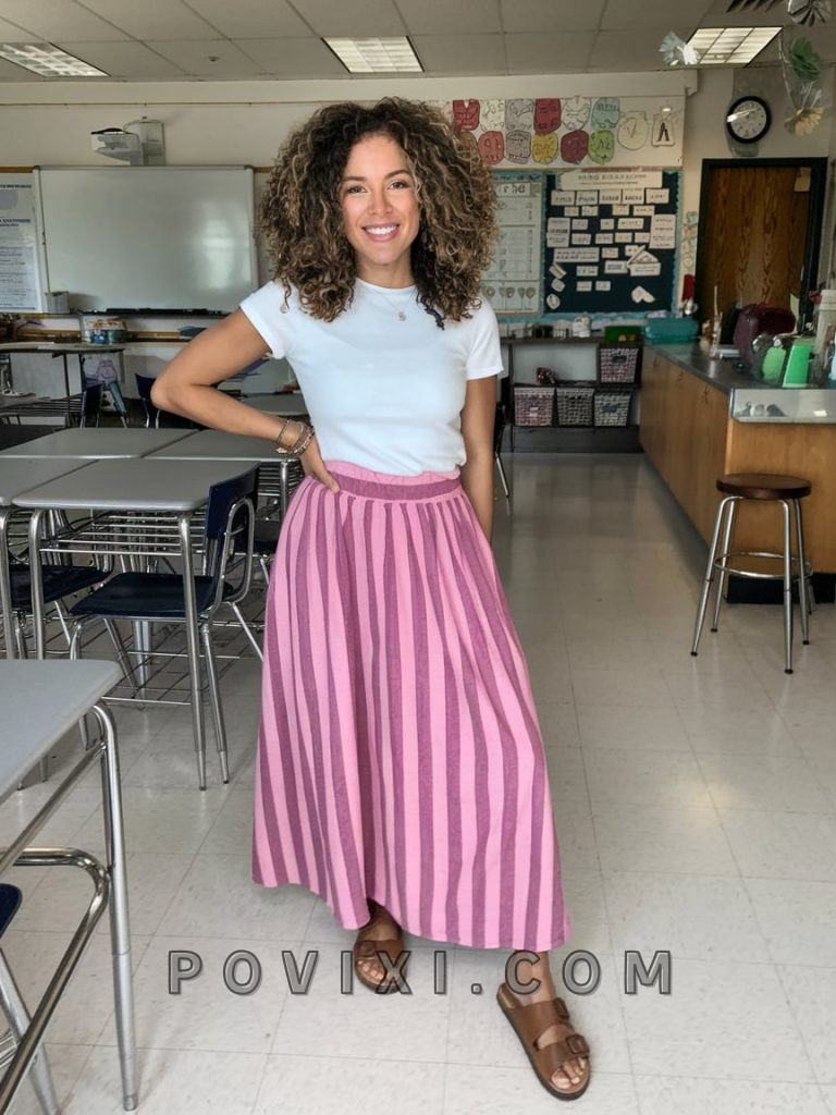 This striped maxi skirt in soft purple hues is ideal for teachers who love elementary comfy yet stylish outfits. The white fitted tee keeps the look balanced and professional, while flat sandals ensure all-day comfort. This is a great late summer look that transitions well into spring. To make this outfit more work-appropriate for UK teachers who might experience cooler temperatures, adding a light blazer or a cropped denim jacket could be a great layering option.