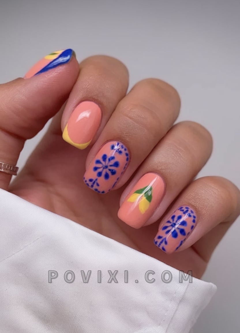 A unique blend of summer happiness defines this fashionable nail style that uses a square short nail motif. This design combines two sets of art: bold blue detailed flowers surrounded by tiny dots on two fingers next to fun yellow lemons and yellow followed by navy blue French tips. This style will appeal to those who like their nails to keep their original look but still have a distinctive character. For a weekend brunch look, wear this style with a white sundress and espadrilles.