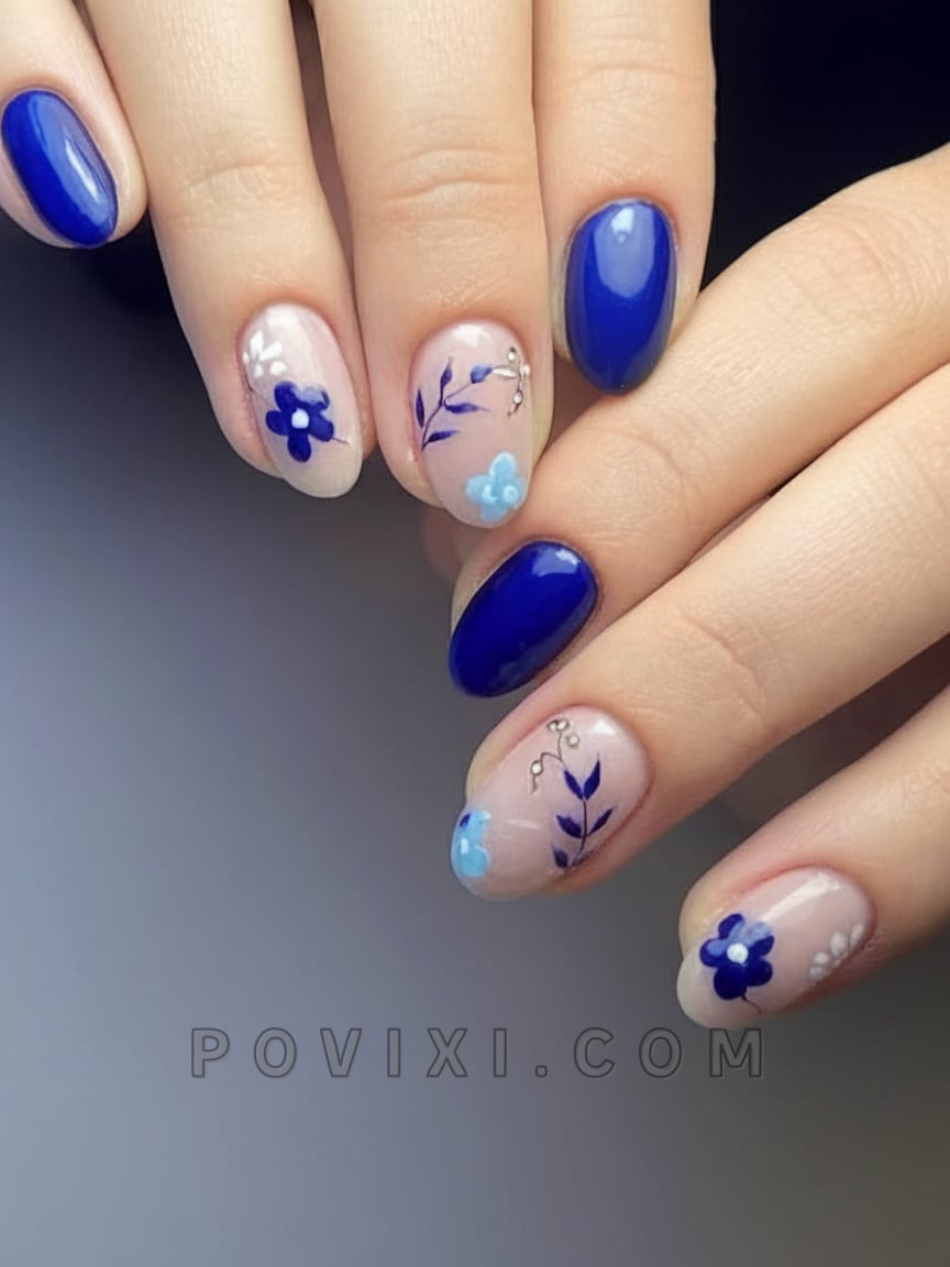 The sophisticated look of this gel manicure combines royal blue and nude components that include subtle floral drawings and leaf designs. The oval nail shape creates a soft look as full nails create dimensional effects throughout the design. These feminine designs would complement linen blazers and white pants for an office-appropriate, on-trend look.
