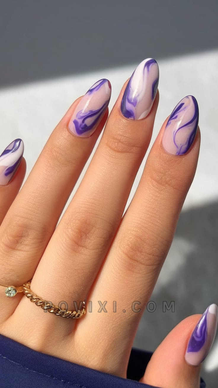 The almond nail design, created with dark blue and purple tones and light shimmering effects, expresses a seaside feeling that transports the mind to a vacation. The elongated almond nail shape is one of the trendy fashion choices for 2025 as it creates graceful finger effects. This bold, gorgeous gel nail design is perfect with silky slip dresses paired with metallic sandals for a beach day.