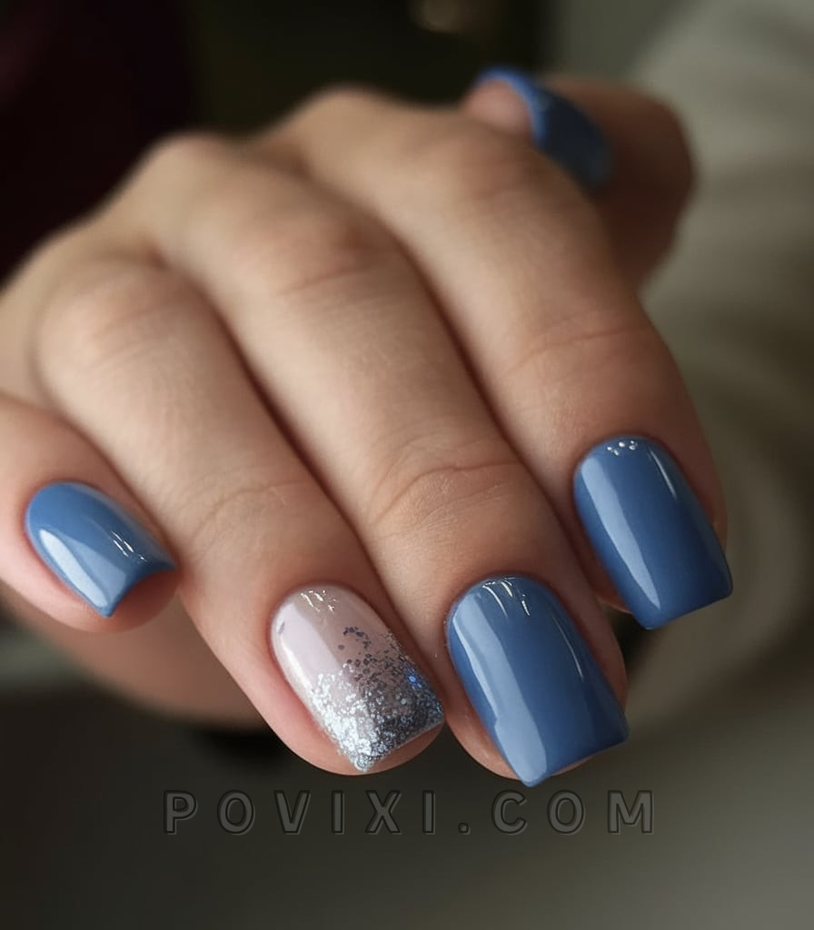 The summer glitter technique achieves precise detail on these nails. A vibrant blue defines a perfect french tip alongside nails that are fully glittered, gently blending from blue to clear. The square nail pattern creates an updated contemporary touch that shines through the glossy finish that enhances all aspects of the design. This nail design is an exquisite choice that would enhance both special events and festive occasions as well as personal self-treatments for a touch of glamour.
