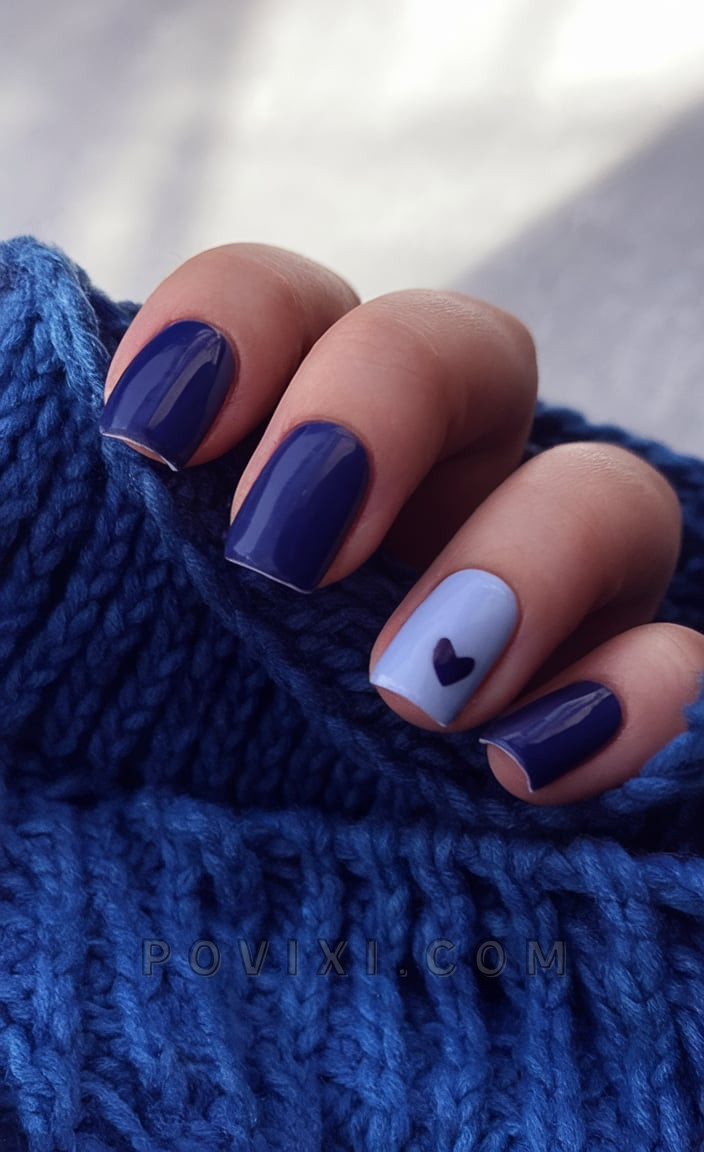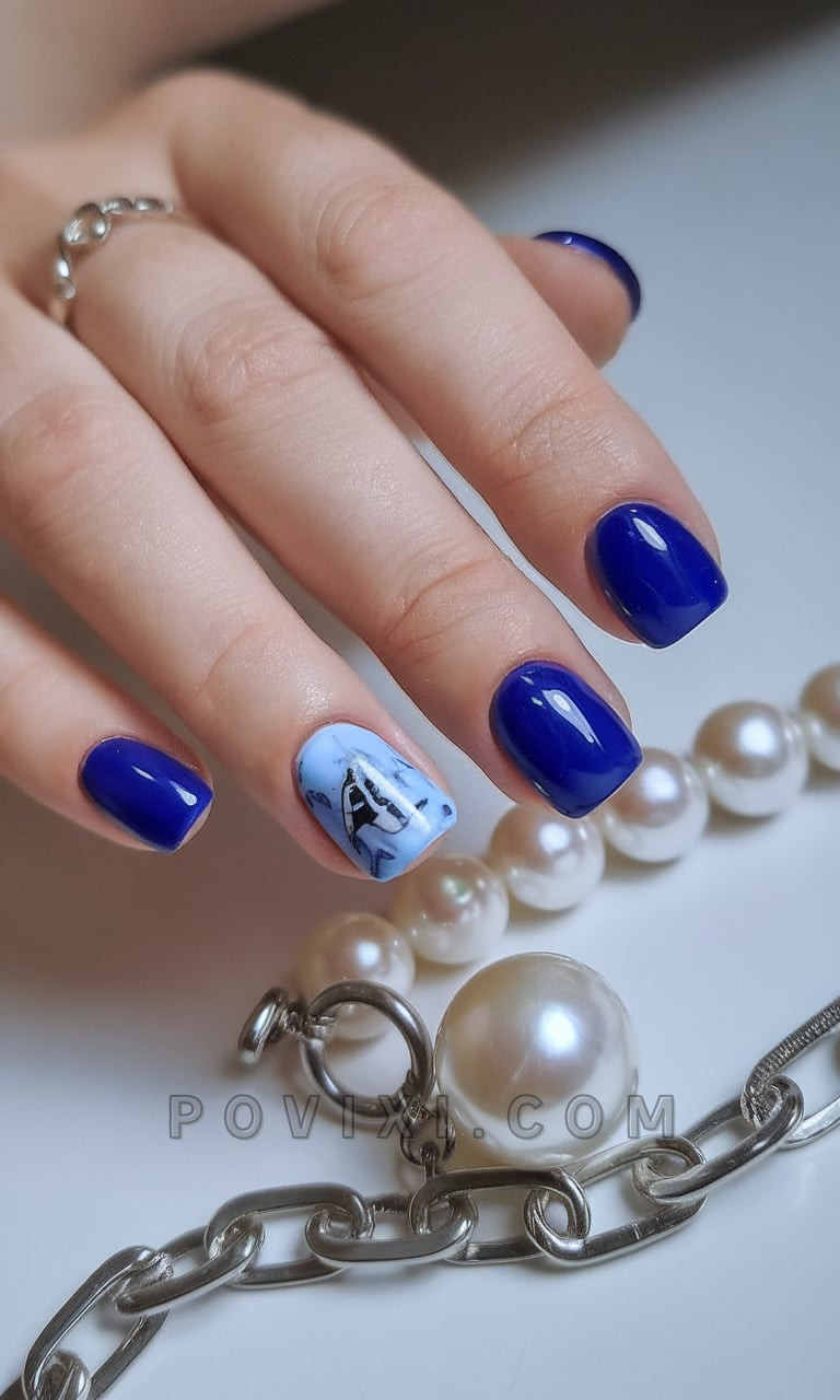 A single square nail stands out from the other blue digits with a white and blue heart pattern. This design introduces a pop of charm while maintaining sophistication in both style and clean elegance. Wear this stylish summer outfit by pairing royal blue nails with white knits and wide-legged pants.