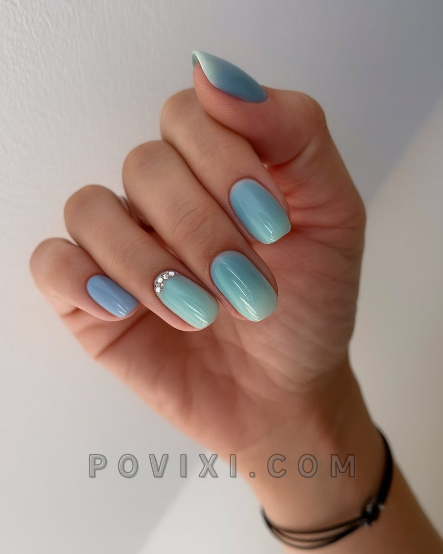 This round nail set from Sub Lemon features a soft ocean gradient that transitions from light to dark blue, with small rhinestone sparkles on one finger for an elegant touch. The oval nail design adds a feminine touch suitable for special occasions and summer social events as well as romantic celebrations. This look is perfect with pastel dresses and delicate jewelry.
