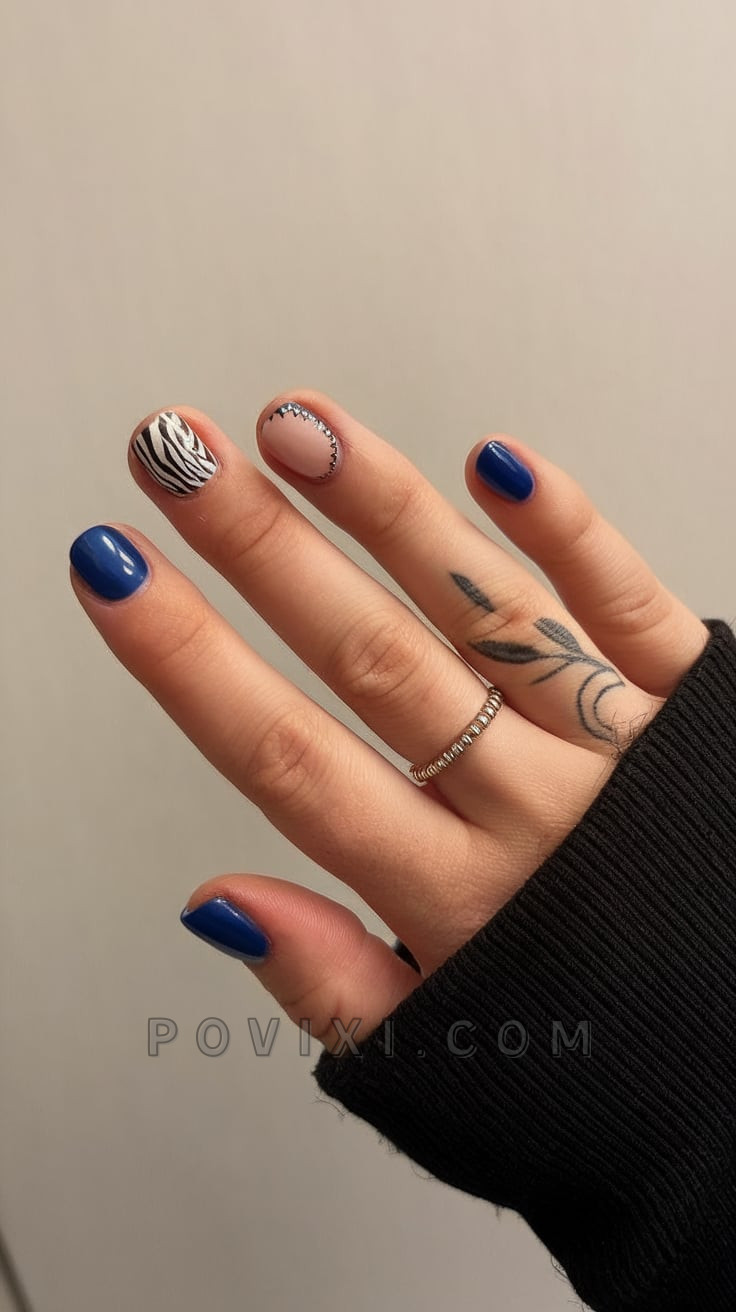 An edgy combination combines bright royal blue nails with black and white zebra prints on two accent nails for those who prefer chic variations. The wearable short square nails are given personality by the animal print design. Pair them with a black mini skirt, leather sandals and a cropped t-shirt for an urban look.
