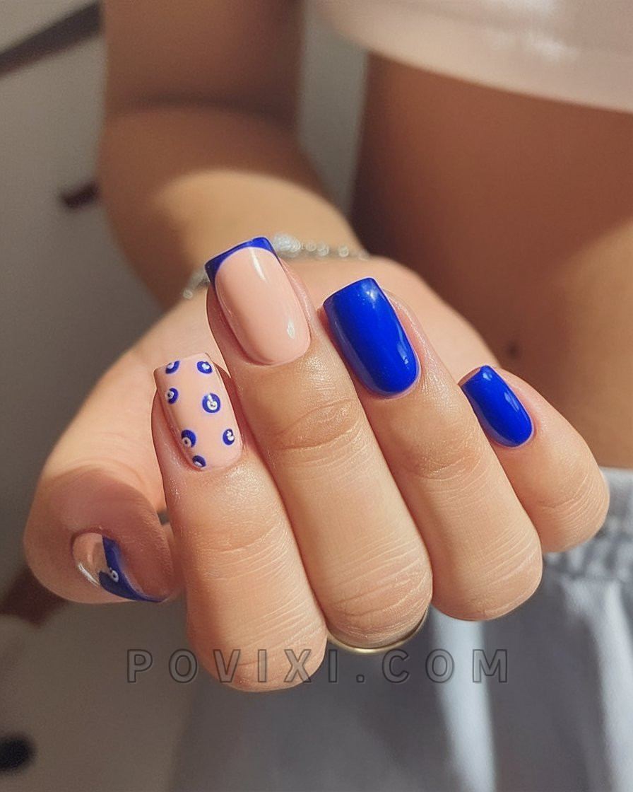 There is a protective acrylic design that combines deep royal blue gel and evil eye accents on small nails. A French tip design with a nude base enhances the appearance of the bold components in the design. Everyone who sees this design will automatically start talking because it combines both style and superstition. Wear these blocks with royal blue denim and a breezy blouse for weekend market visits or festivals.