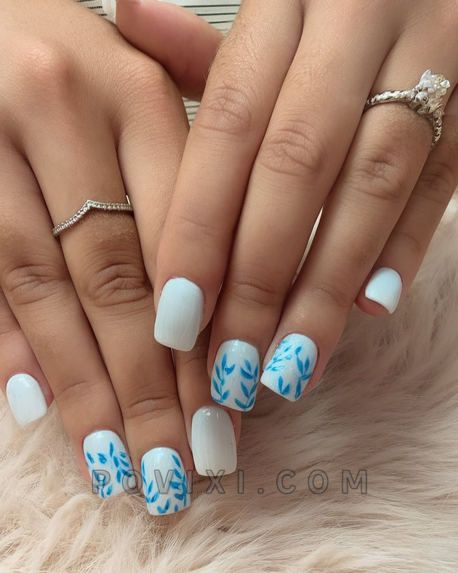 The design incorporates white along with blue for a fresh aesthetic. The intricate blue leaf designs created on the soft white gel polish transform it into a vibrant base. The simple square nail shape provides an elegantly textured look that combines with a short and sophisticated style. If you are looking for designs that make a strong statement, you can wear this look effortlessly to brunch or business meetings with matching outfits.