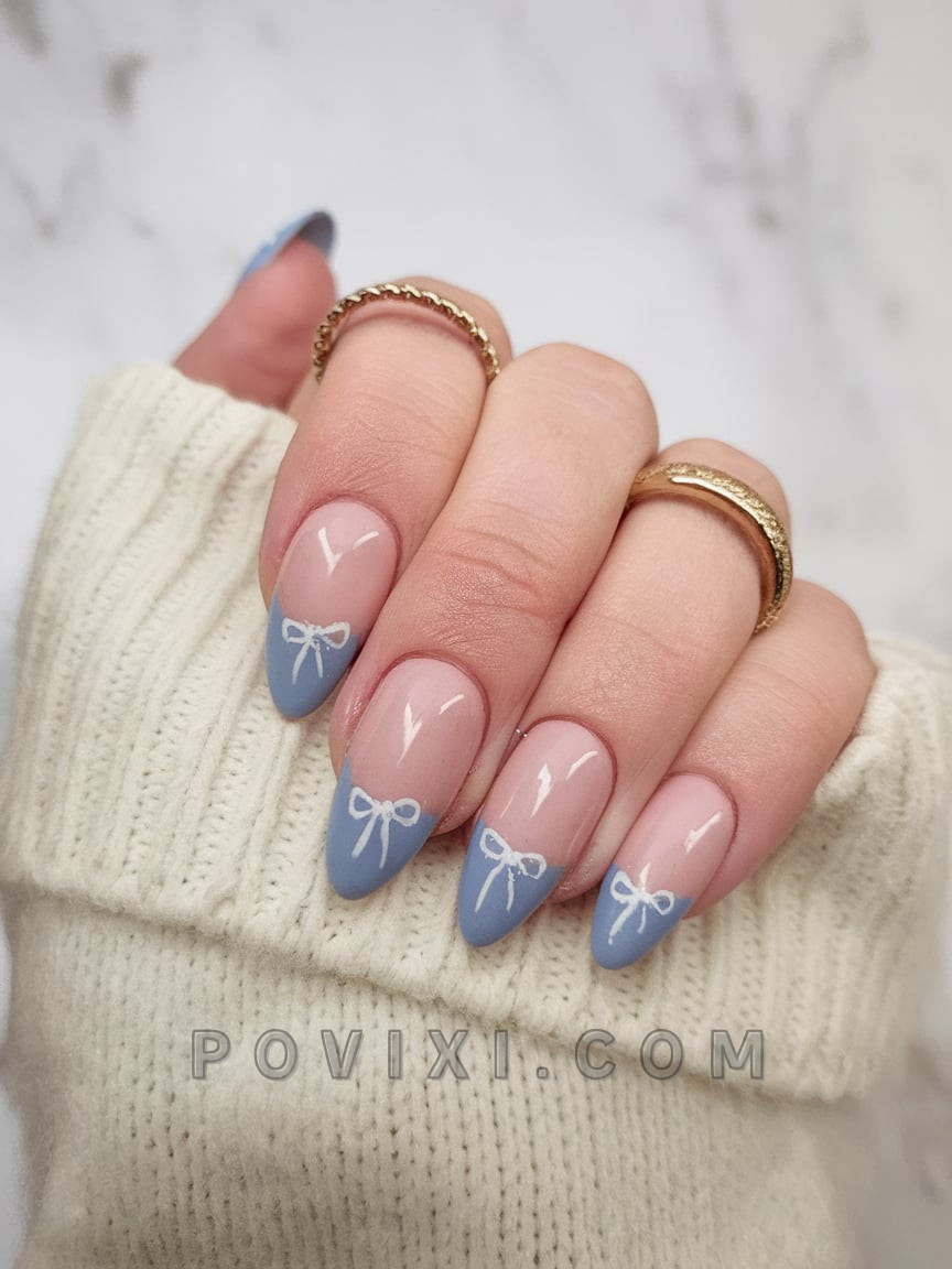 The nail design combines light blue french tips to achieve doll features while white bows add an elegant finish to each nail. The almond-shaped nails add a sophisticated touch to what would otherwise appear to be a childlike design. These gel nails would add elegance to pastel dresses and beaded centerpieces at outdoor parties and bridal showers.