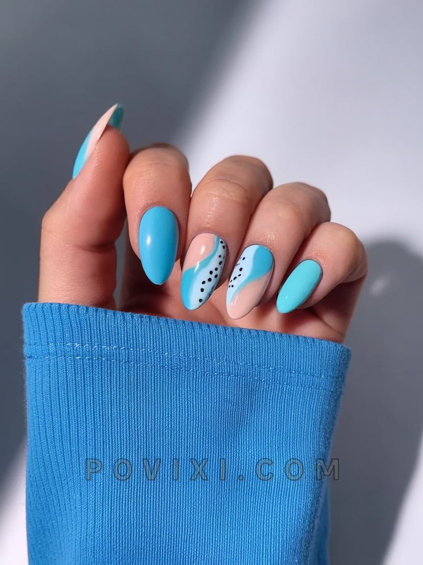 The almond-shaped nails feature vibrant blue, turquoise and soft blush hues that create vibrant tropical patterns on each nail surface. Salmon-colored polka dots add style to the manicure, which remains smooth thanks to the glossy gel surface. These nail designs work best when paired with either two-piece swimsuits or beach cover-ups with sandals.