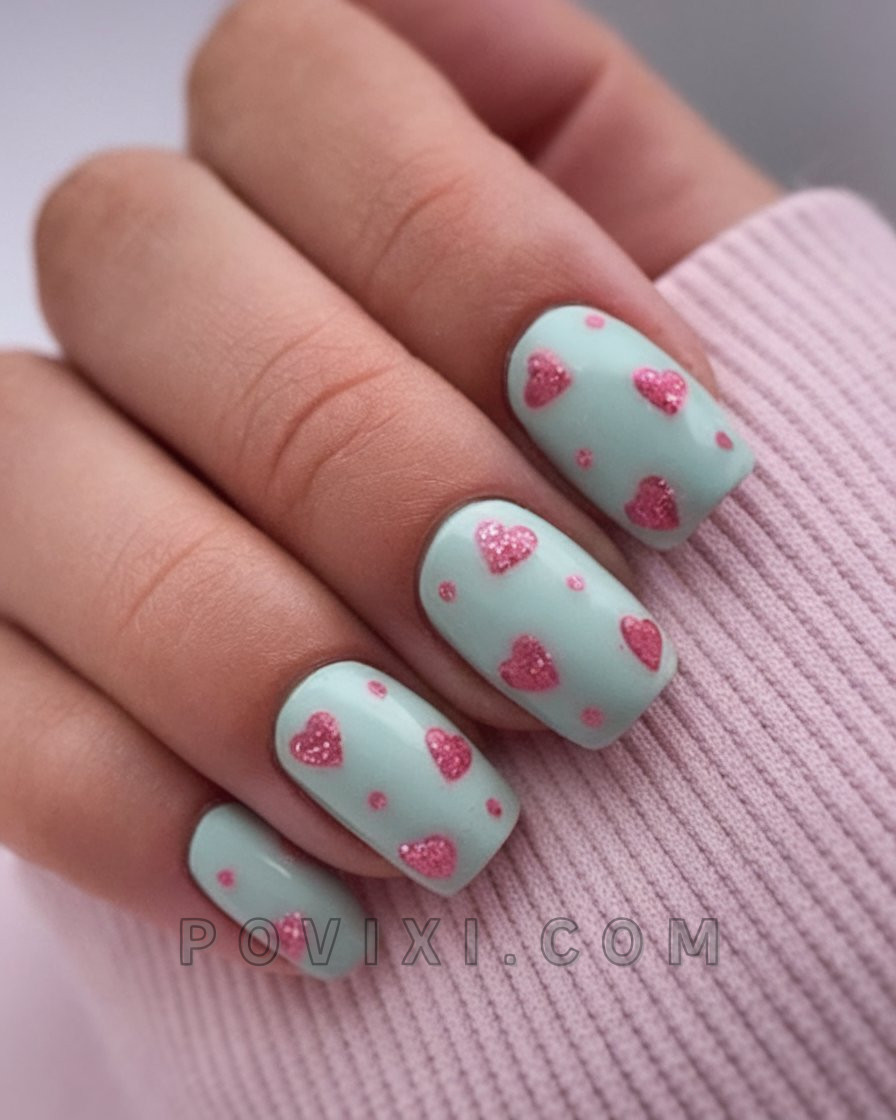 The square short nail style blends light mint blue with fun textured pink hearts along with distant polka dots. The distinctive matte appearance creates a combination of adorable pop art elements with a delicate romantic atmosphere. The matte mint blue manicure looks best with tan skin when paired with a soft pink oversized sweater or a blue romper for retro-girly summer outfits.