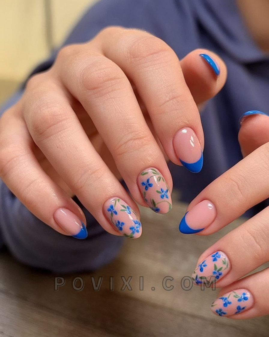 French tips get a fresh transformation by juxtaposing royal blue ends with small floral patterns that appear on alternating nails. The oval nail design comes with a translucent nude base for a light, summer-ready effect. Great for everything from brunch to date night, especially with a flowy floral dress or navy jumpsuit.