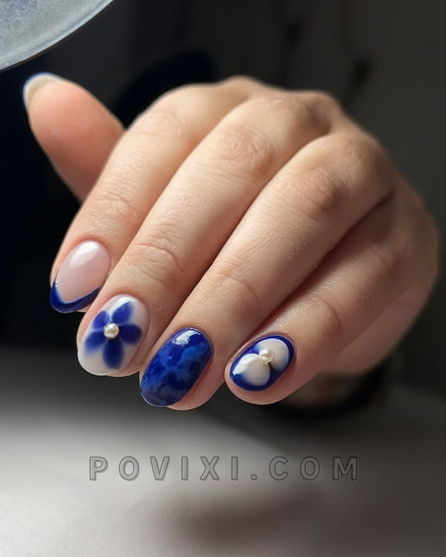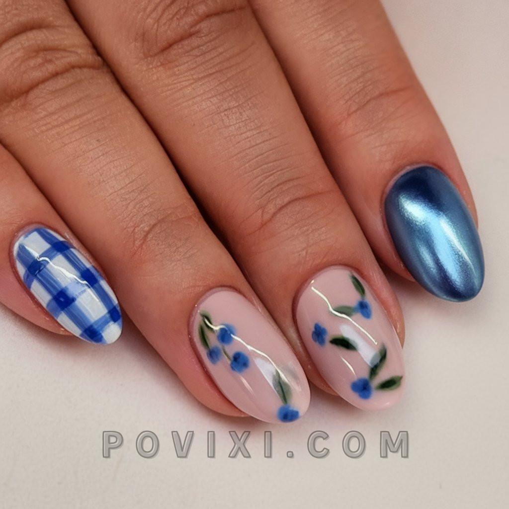 This manicure combines a semi-transparent beige base with blue floral patterns and a metallic chrome accent. A blue square-based pattern reimagines the traditional plaid design on one nail. The bold, modern look of high-waisted jeans paired with a satin blouse perfectly complements the artistic texture of this nail style.