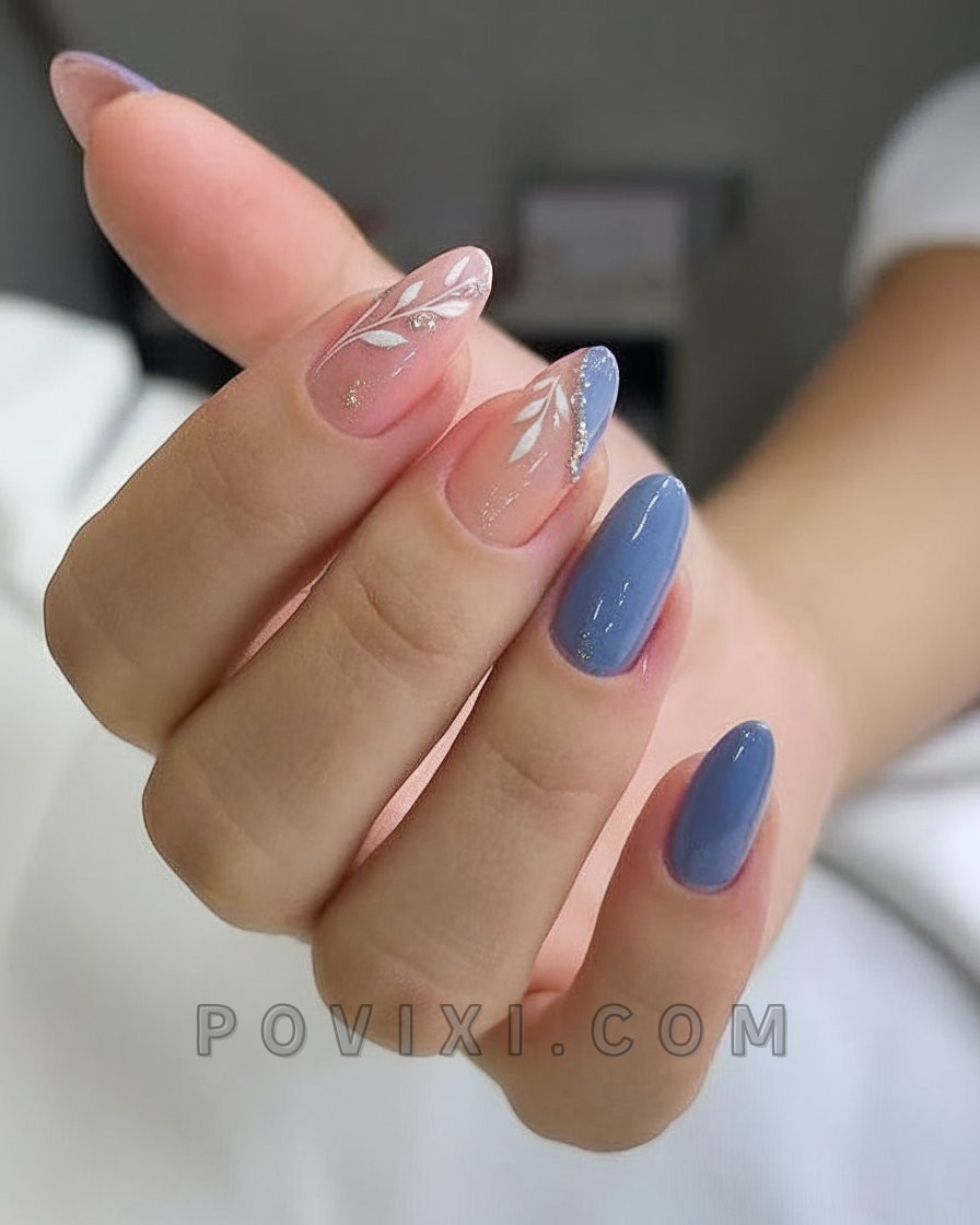 White botanical art on a clear base provides a spectacular contrast with muted blues that evoke peace. A set of almond-shaped gel nails presents both solid color and fine detail patterns to create an overall elegant look. This color style creates a soft but bold effect that suits women looking for relaxed, modern styles. The combination of nail length and glossy top coat creates a sophisticated style that’s not too noticeable.