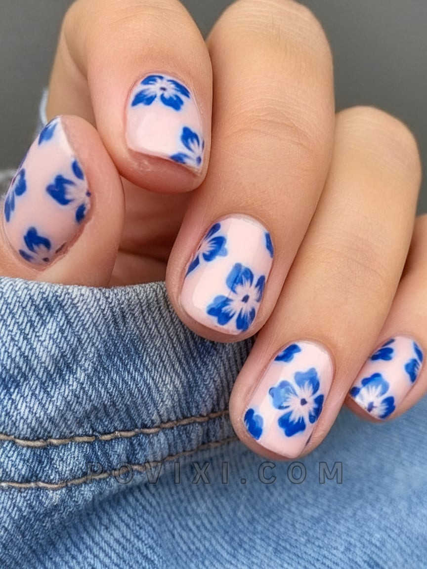 A bold take on the classic floral mani. The nail design features blue flowers meticulously hand painted on a translucent light pink base to create an appealing visual effect. This manicure design features short, round nails that remain casual yet draw attention to the intricate floral designs. Beautiful vintage patterns fused with denim designs blend seamlessly to capture the essence of summer gardens.