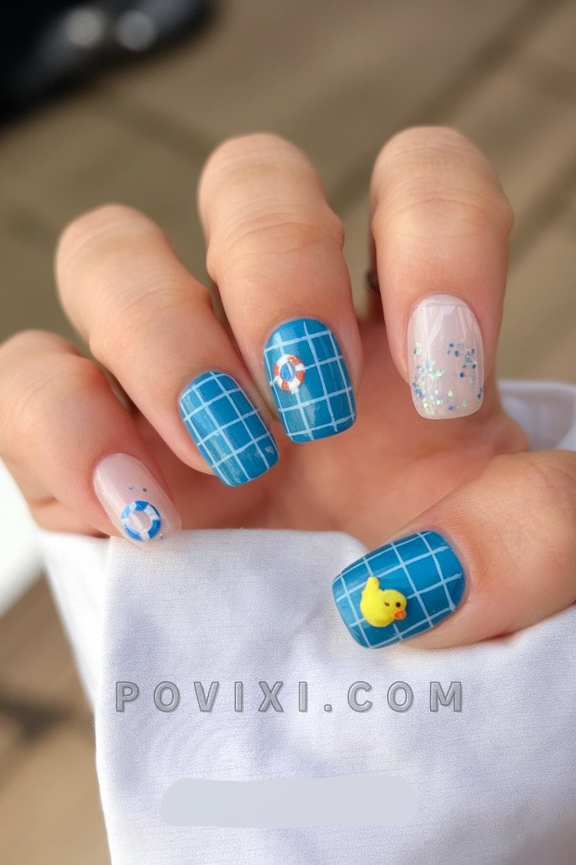 This manicure delivers an overall vibe that combines pool parties with fashionable fun. The manicure uses electric blue and white grid patterns that resemble swimming pool tiles, along with rubber duck and floating decal accessories that enhance the playful charm throughout the design. The square outline of the nails enhances the grid pattern and the shiny top coat creates an enchanting splash effect. These bold nails create visually appealing works of art that are sure to spark conversation this summer.