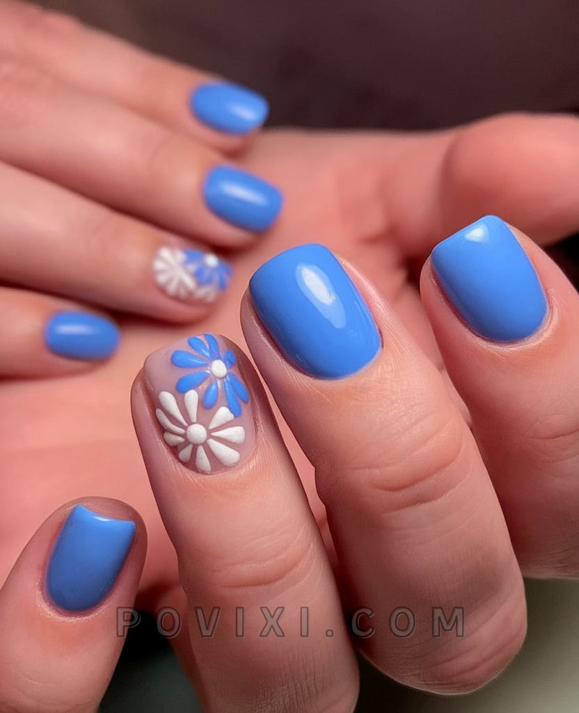 Short acrylic nails colored with bright and beautiful shades add a balanced look to any outfit. The majority of the nails are covered in vibrant blue, while one nail features blue and white daisy decorations. The square creation maintains order, but the floral accents create a charming addition without dominating the manicure design. This design works with all summer outfits including sundresses or denim looks and contributes to a fun, versatile summer style.