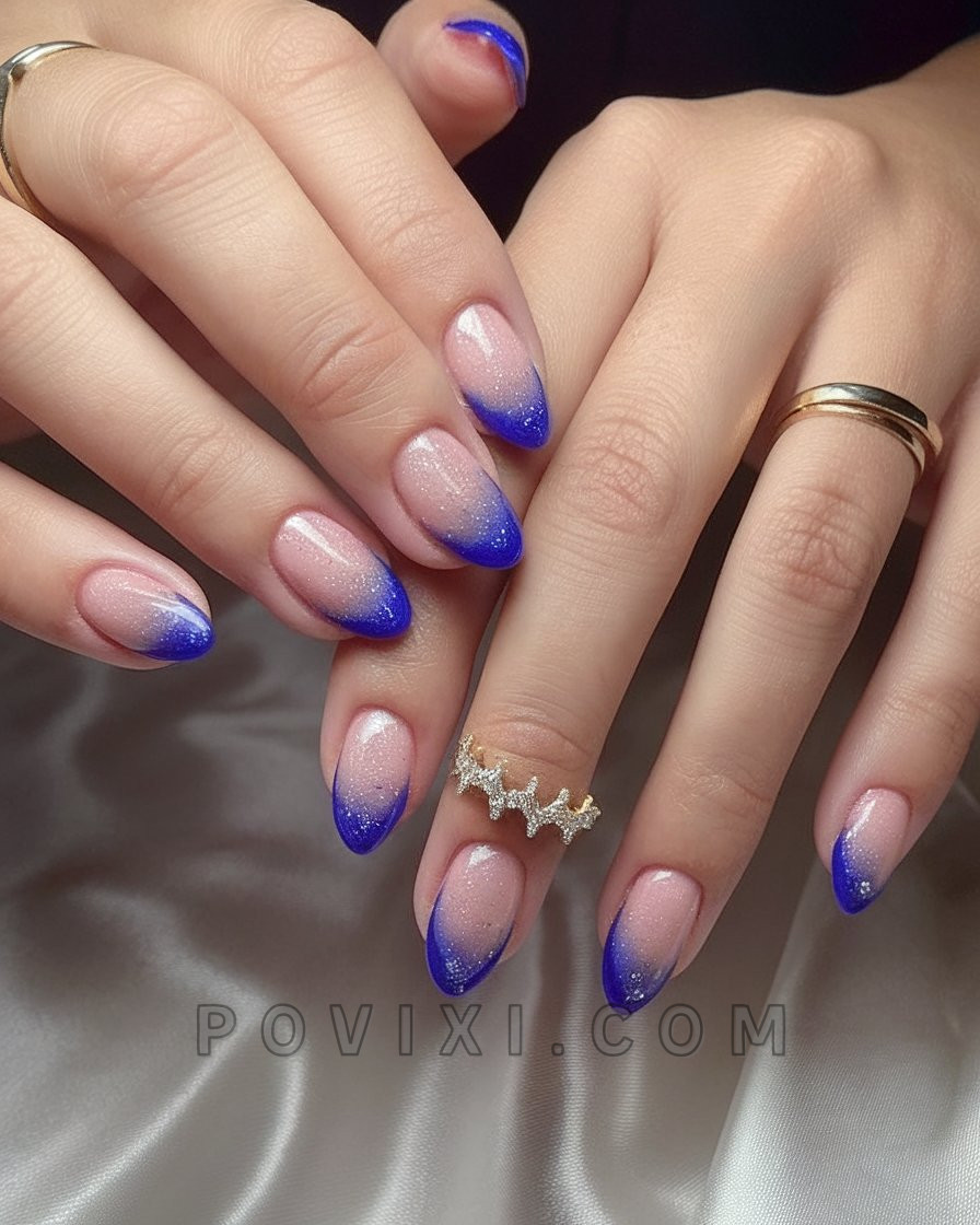 The design features a light blue base that accentuates sharp electric royal blue French tips for a vibrant look. A shiny finish gives the design a contemporary feel that works well with both everyday and formal outfits. The oval nail shape adds elegance to the fingertips, making these nails suitable for summer lunch dates as well as gallery visits.