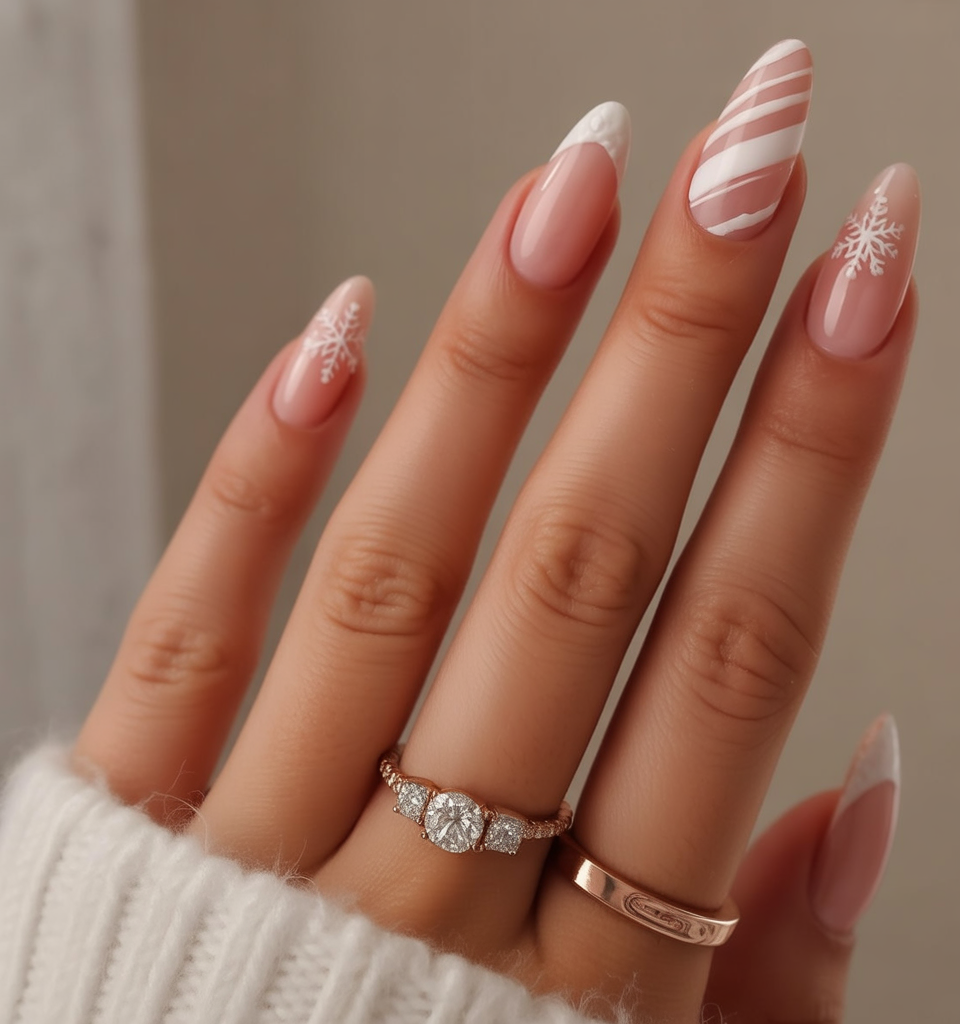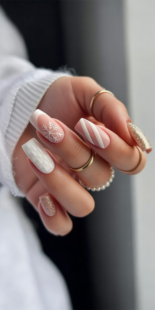 These white christmas nails mix textures beautifully: glittery gold, candy cane stripes, and even a woven sweater-like effect. The almond shape elongates the fingers, while the combination of patterns creates a warm yet glamorous holiday feel. It’s a manicure that celebrates both coziness and sparkle.
