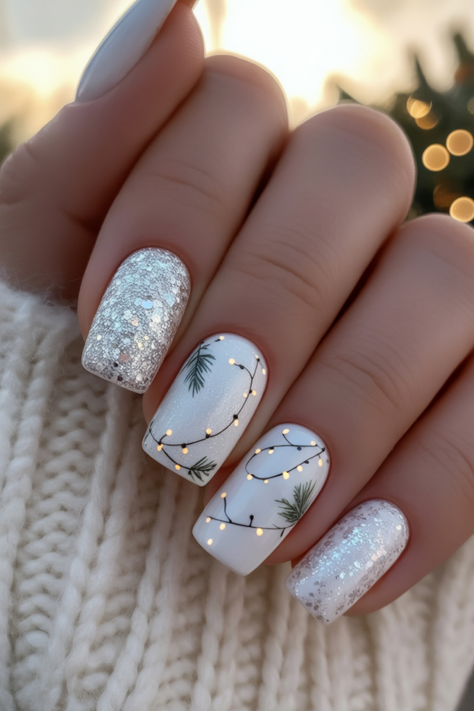 11. Holiday Lights White Christmas Nails