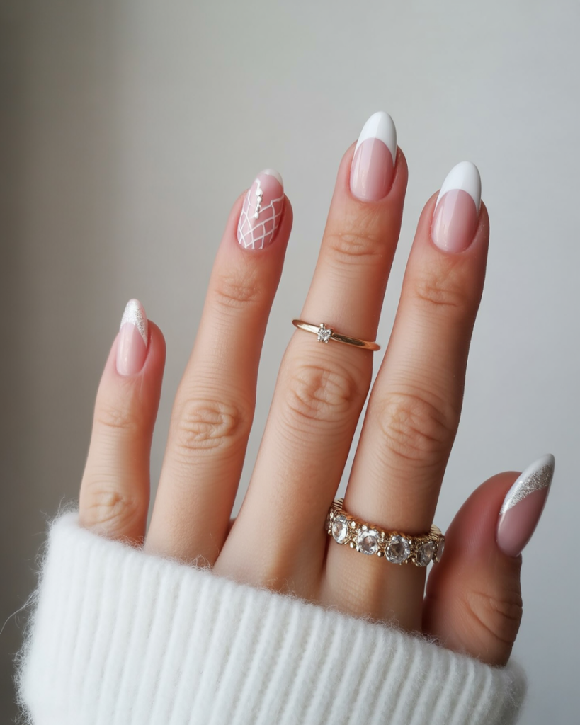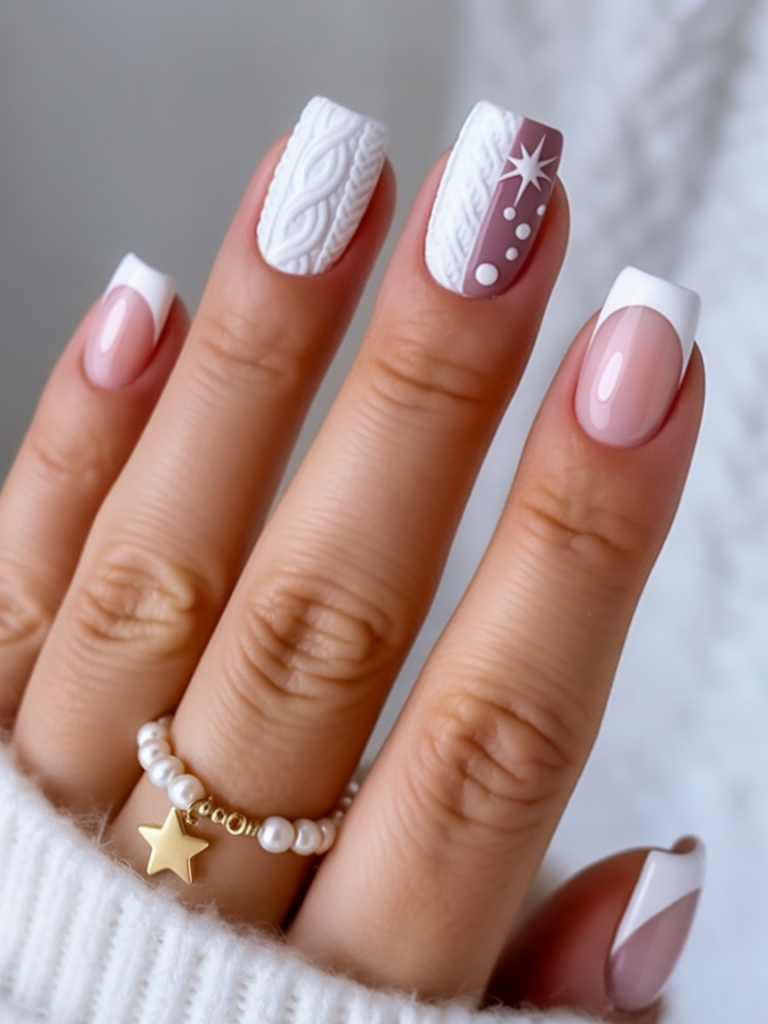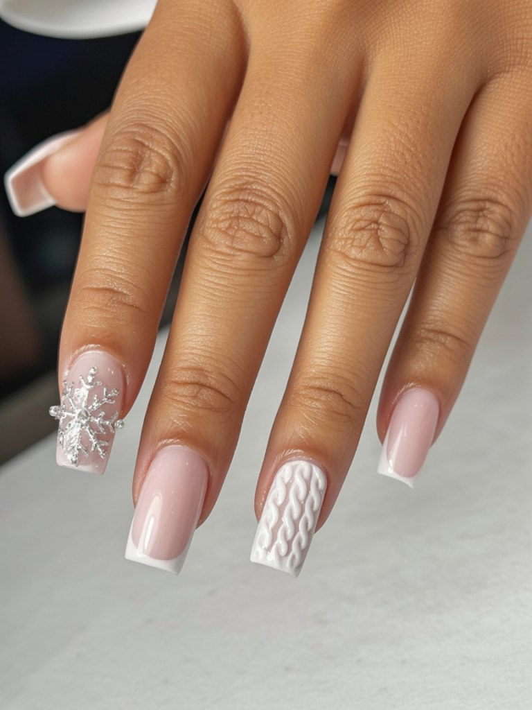 This manicure blends timeless French tips with playful winter accents like a sparkling snowflake and sweater-knit design. These white christmas nails are understated yet full of personality, giving off the feeling of cozy winter nights wrapped in a soft blanket. The look is classic with a fun seasonal twist.