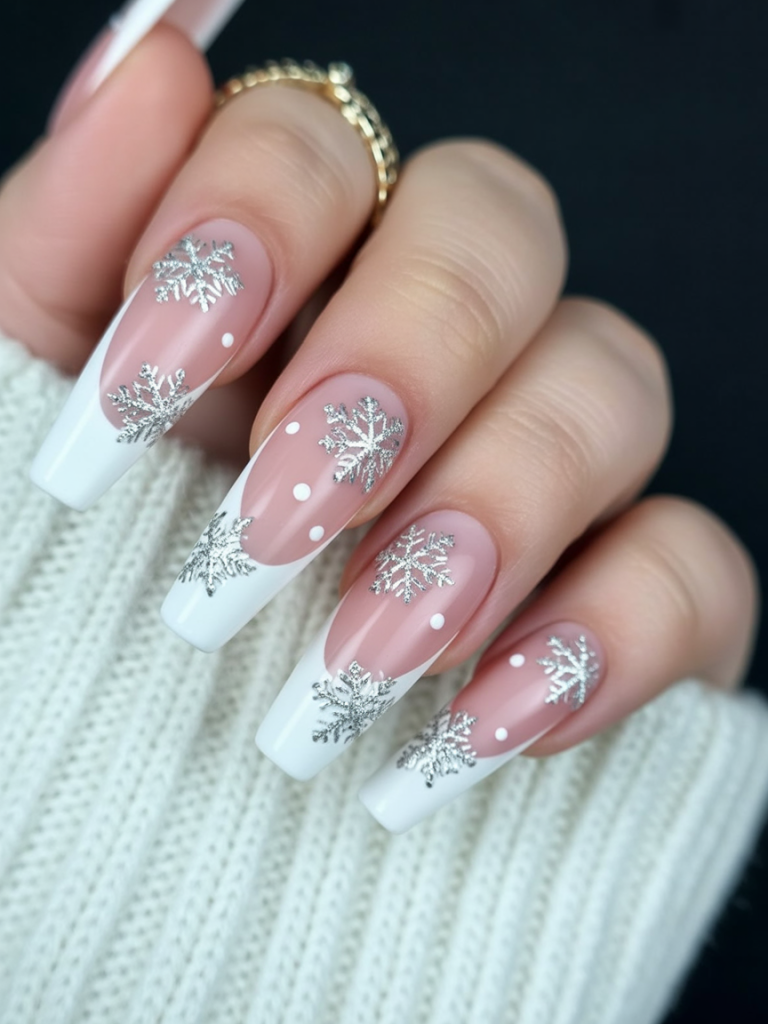 These white christmas nails sparkle with silver snowflakes and a chic French tip. The long square shape makes the metallic designs pop, while the soft nude base keeps them elegant and balanced. It’s a sophisticated take on festive nails that instantly adds glamour to your holiday look.