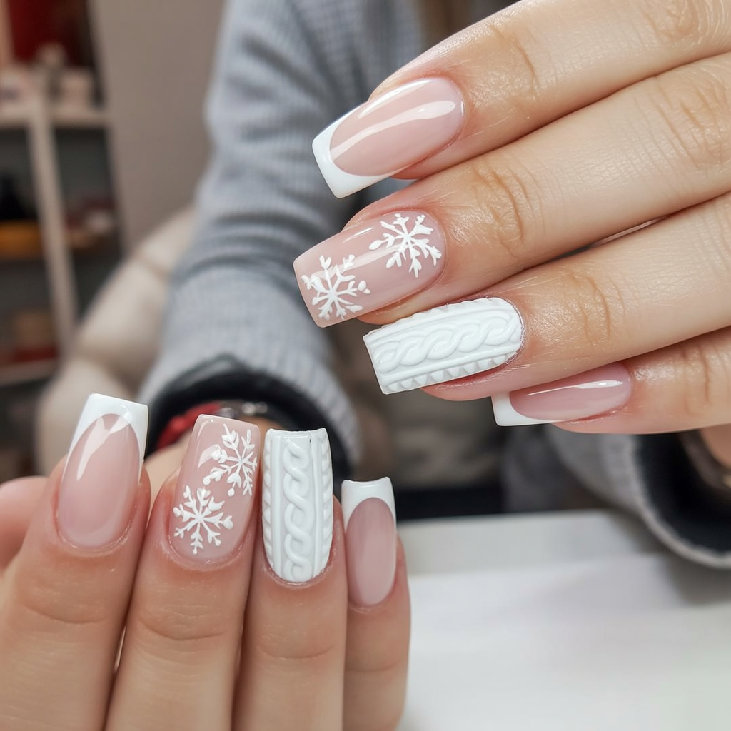 16. French Tip with Snowflakes and Sweater White Christmas Nails