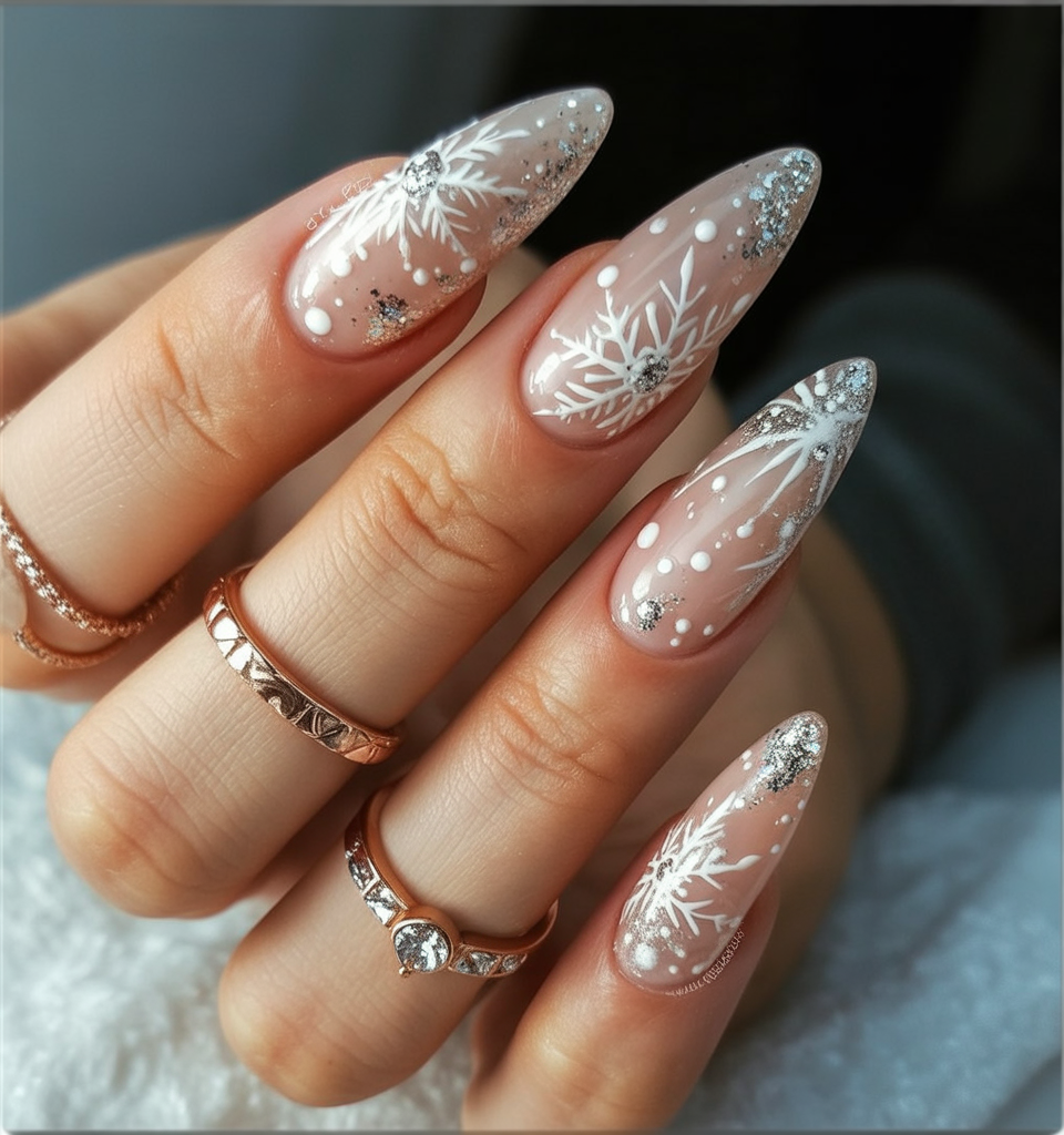 This design is perfect if you want something trendy but not too flashy. The matte finish is low-maintenance and hides tiny chips well, making it practical for everyday wear. The almond shape elongates the fingers, while the snowflake art adds just the right amount of seasonal detail. It’s a versatile choice you can easily dress up or down.