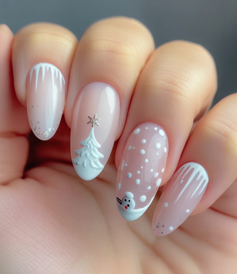 2. Snowman and Winter Wonderland White Christmas Nails