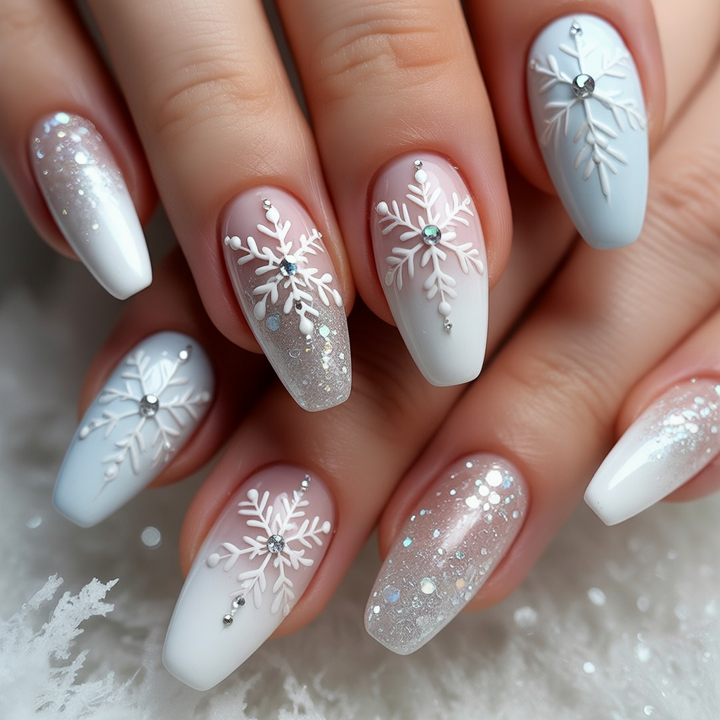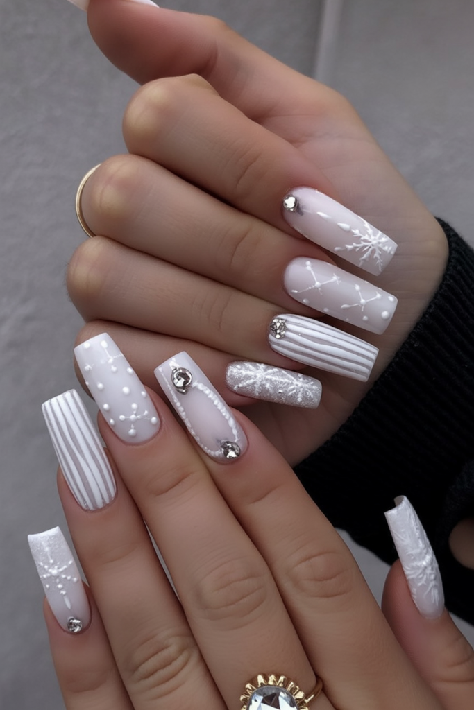 These white christmas nails go all out with rhinestones, glitter, and textured details. From striped accents to raised snowflakes, each nail tells its own story while still keeping to a frosty white palette. It’s a bold, glamorous look that’s perfect for women who love to stand out.