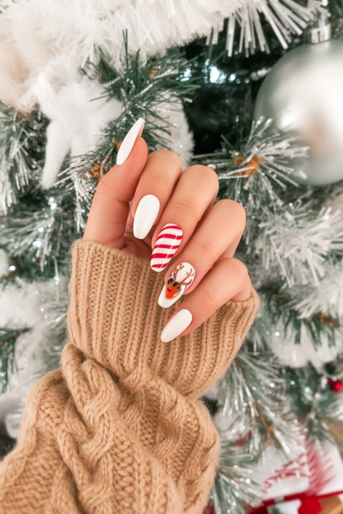 These white christmas nails are full of holiday cheer, featuring pure white nails with fun accents like candy cane stripes and a cute reindeer. The playful design makes them feel warm, joyful, and perfect for anyone who loves adding a whimsical touch to their manicure during the season.
