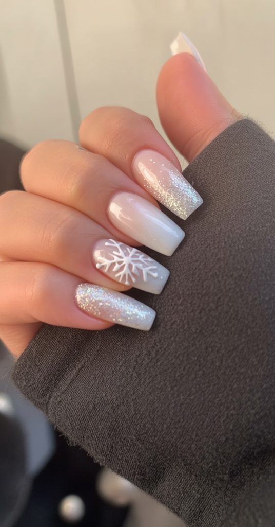 These white christmas nails glow with a soft ombre of glitter fading into a clean base, topped with a delicate snowflake. They sparkle gently like frost in the morning sunlight, making them timeless, elegant, and perfect for winter celebrations.