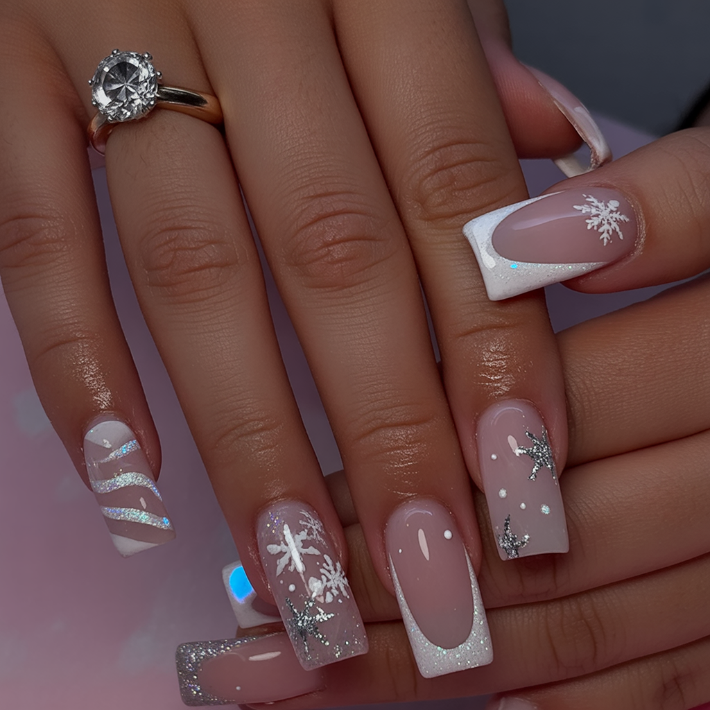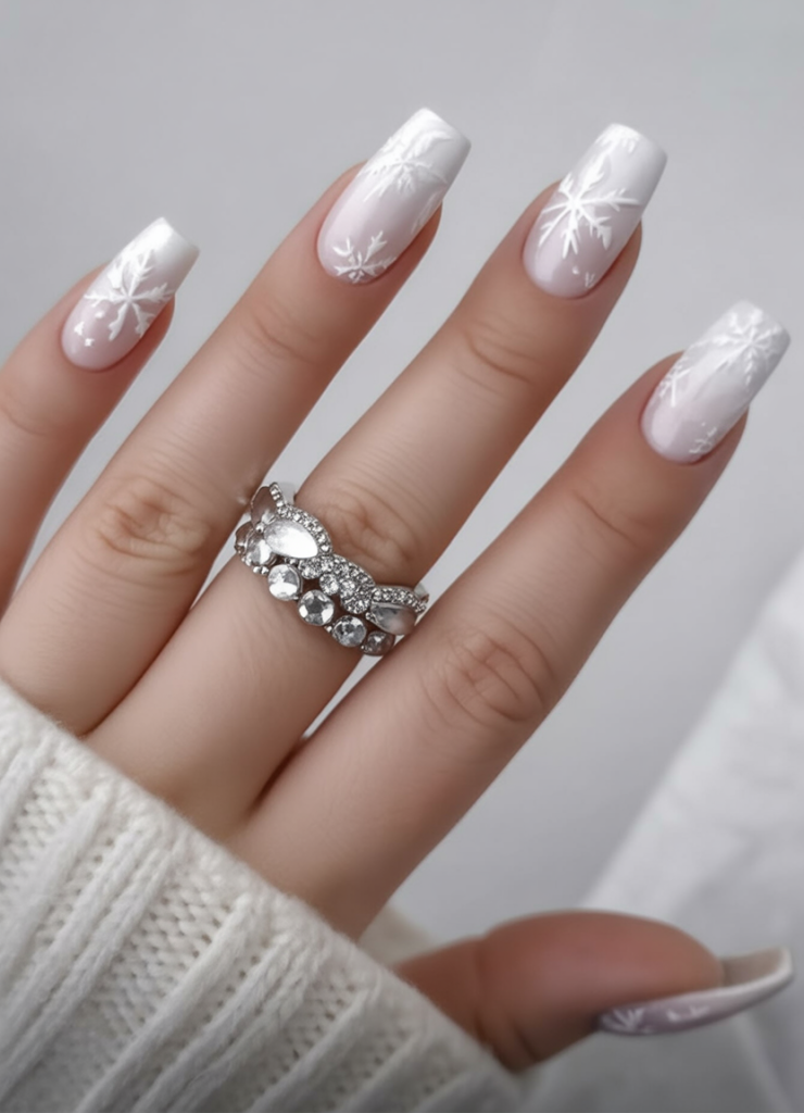 Square acrylics are perfect for this design, giving enough canvas space to show off the detailed art. The mix of glitter and snowflakes suits anyone looking to add a little glam to their holiday look. And because it balances neutral tones with sparkle, it can work for both casual gatherings and full-on holiday parties.
