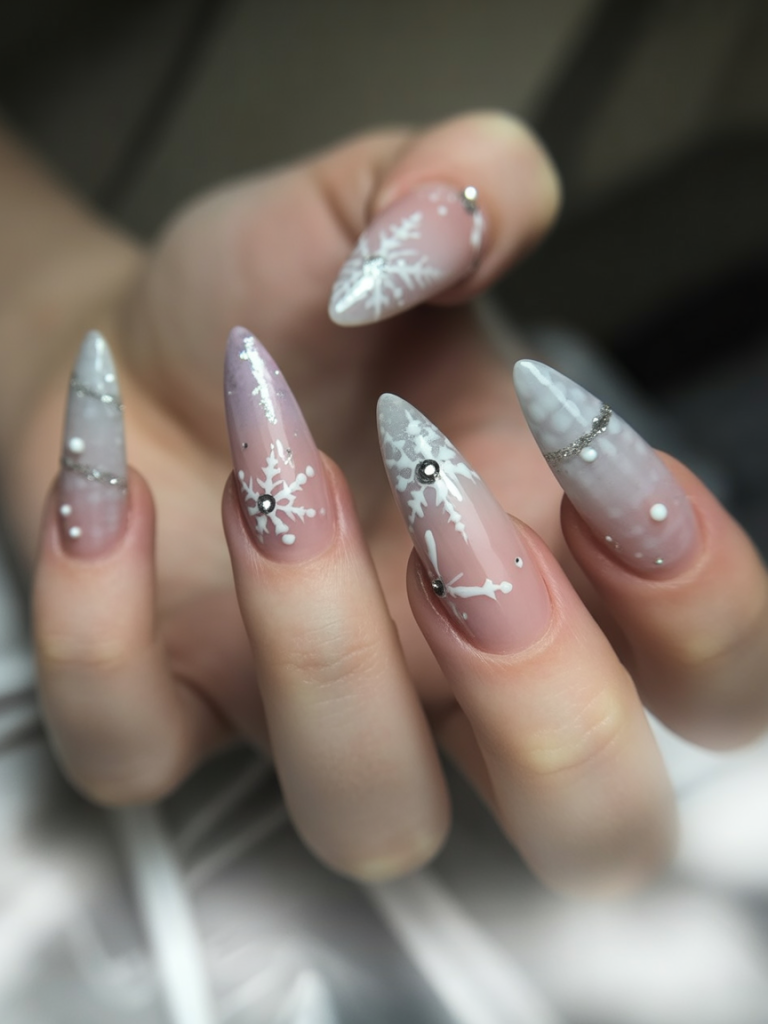 26. Snowflake Stiletto White Christmas Nails