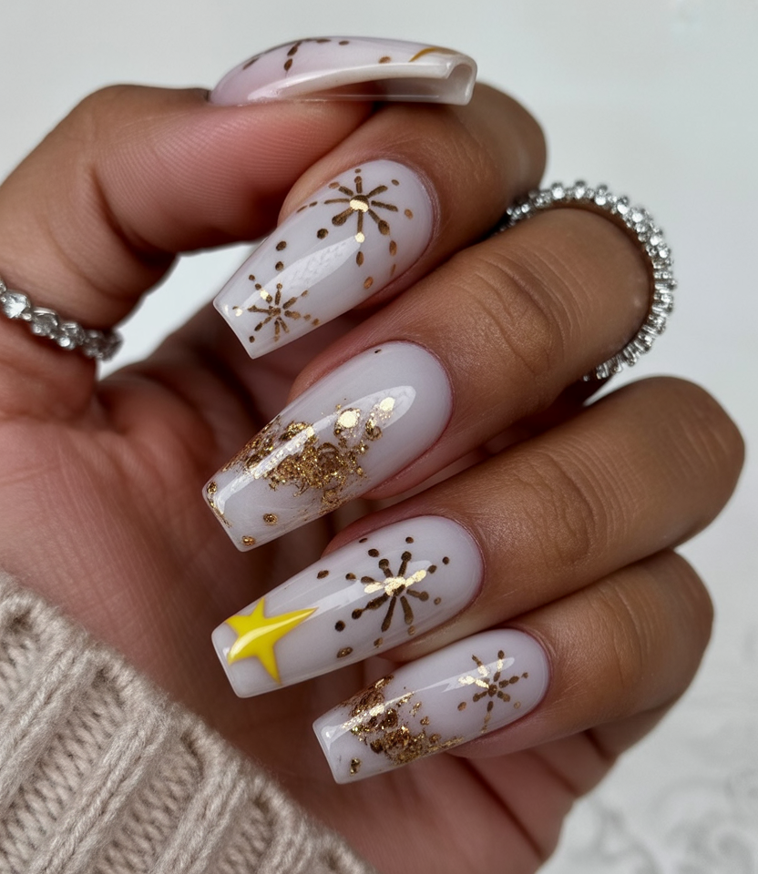These white christmas nails shine like holiday fireworks with golden sparkles and starburst details. The coffin shape gives them a glamorous edge, while the yellow star accent adds a playful twist. It’s the kind of design that feels both festive and bold, perfect for anyone who wants their manicure to stand out during the celebrations.