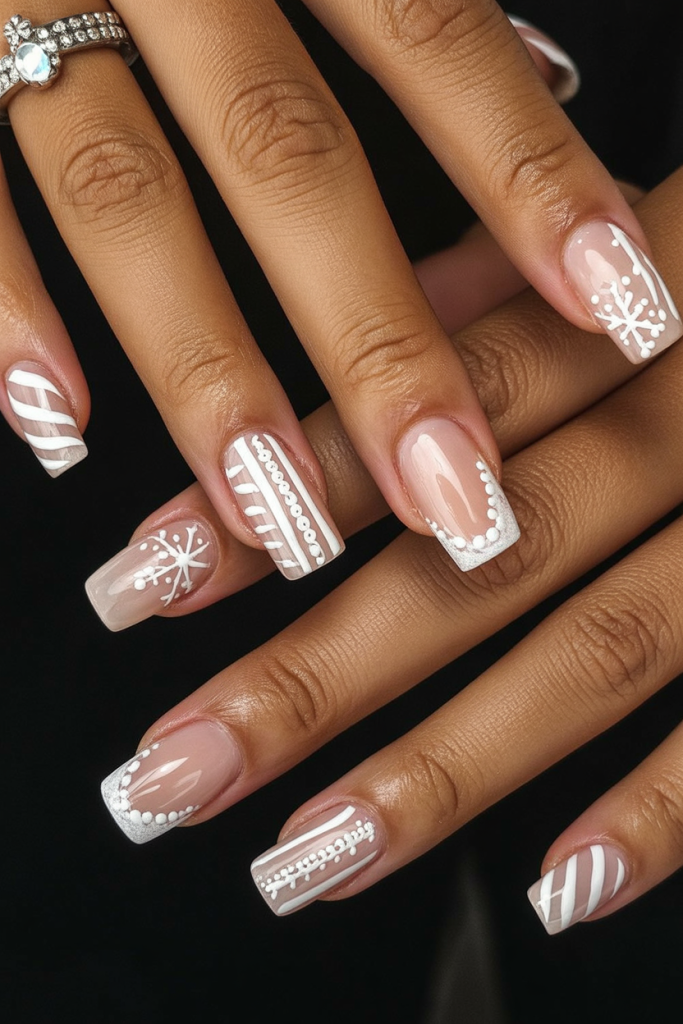 1. Candy Cane and Snowflake White Christmas Nails