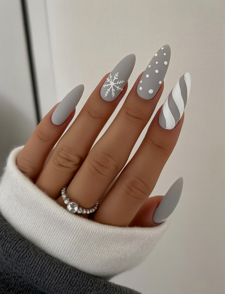 8. Matte Grey and White Snowflake Christmas Nails