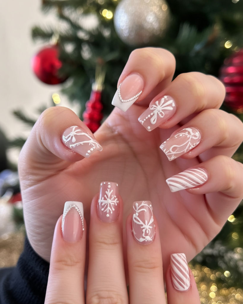 These white christmas nails play with classic patterns: candy cane stripes, dotted lines, and snowflakes all across a neat square shape. The mix-and-match look feels cheerful and modern, like unwrapping a box of assorted holiday ornaments. It’s stylish yet lighthearted, giving your nails personality without overwhelming them.