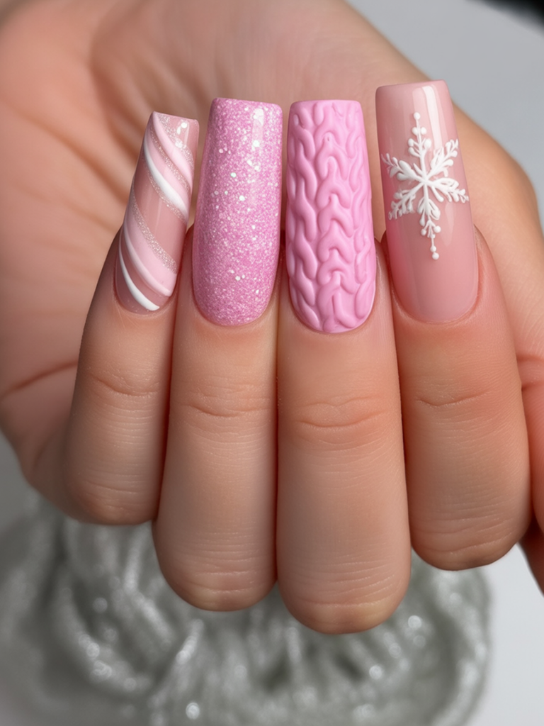 These long pink nails feel like a playful mix of sweetness and bold winter charm. The candy stripe detail, the shimmer, the textured knit-inspired accent, and the crisp white snowflake all come together to create a look that’s cozy yet glamorous. It’s the kind of design that feels like wrapping yourself in a soft sweater while still giving off serious baddie vibes.